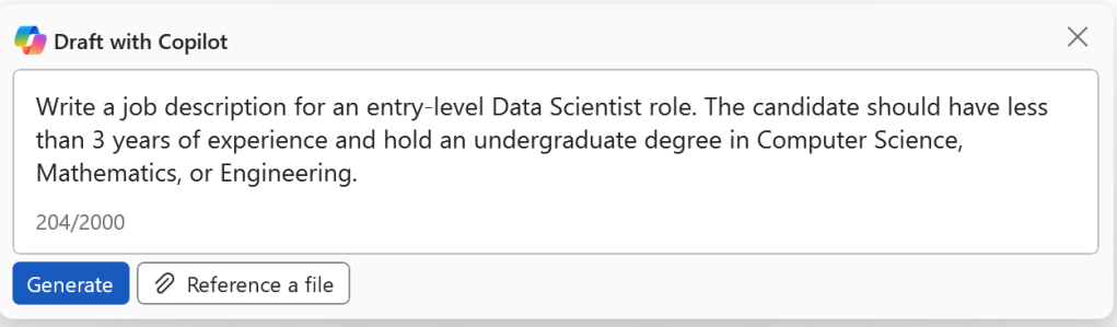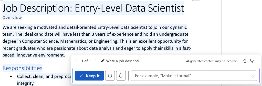 I found Word extremely helpful, especially when dealing with writer’s block. One of the most useful prompts for me was to draft a job description.